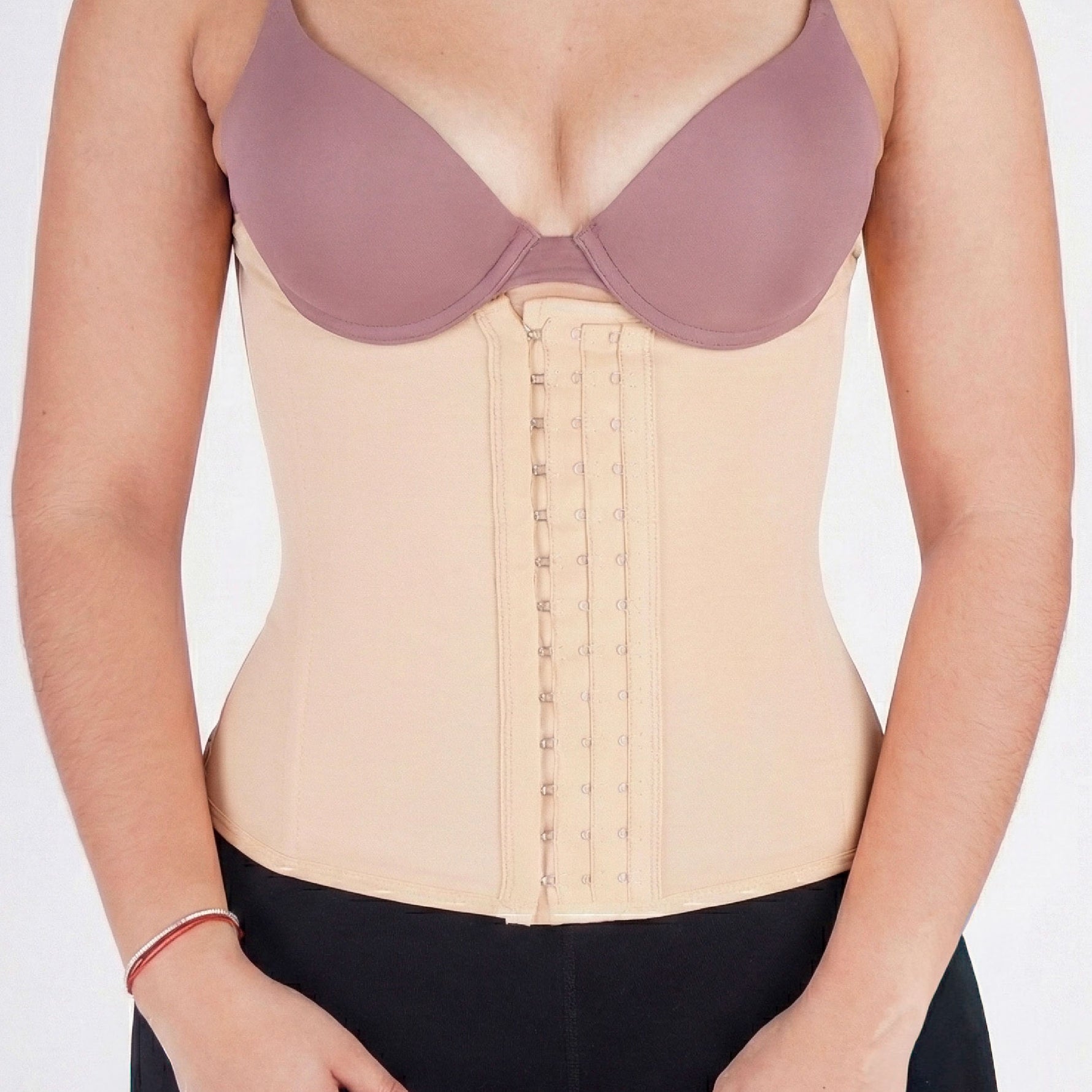 1. Colócala correctamente: Abrocha la cinturilla desde la parte inferior hacia arriba, asegurándote de que quede alineada con tu cintura y abdomen para un ajuste uniforme.